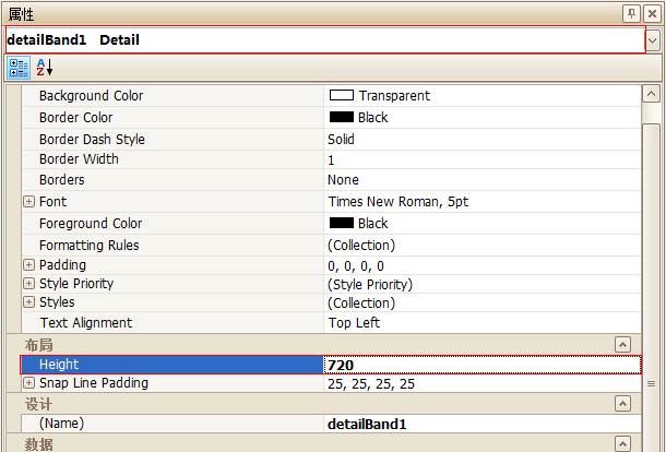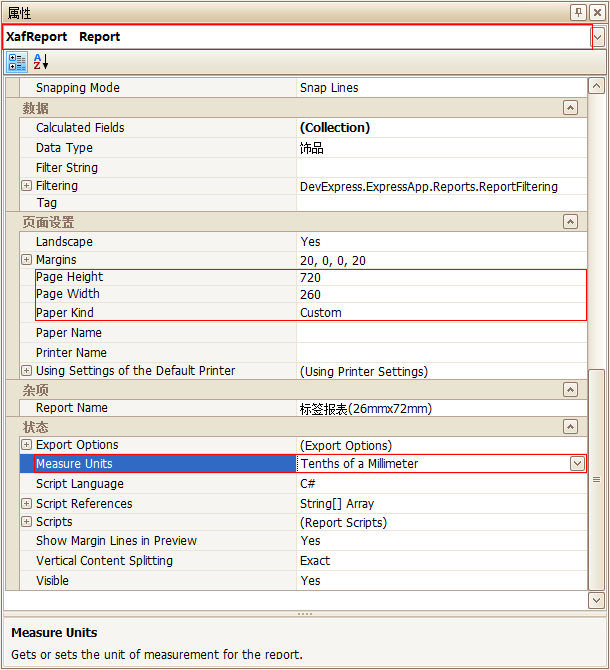 以72mm*26mm的报表来设计,在报表的属性中设置Pager Kind:Custom;Page Height(报表高):720;Page Width(报表宽):260;Measure Units:Tenths of Milimeter(以毫米为单位),如下图所示:
