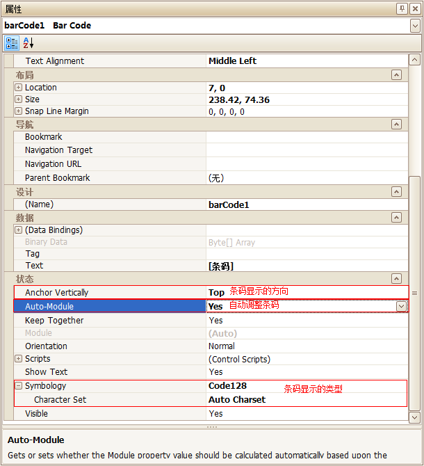 选择条码,属性出现如图,把Auto-Module属性设置为yes,其它设置请看下图: