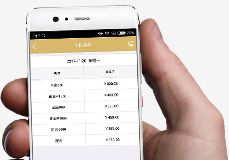 APP每日自动更新K金、黄金、铂金、白银等首饰商品的每克单价。销售人员可以通过APP随时查询,销售或回收相关产品时自动根据商品重量按单价计算商品价格。