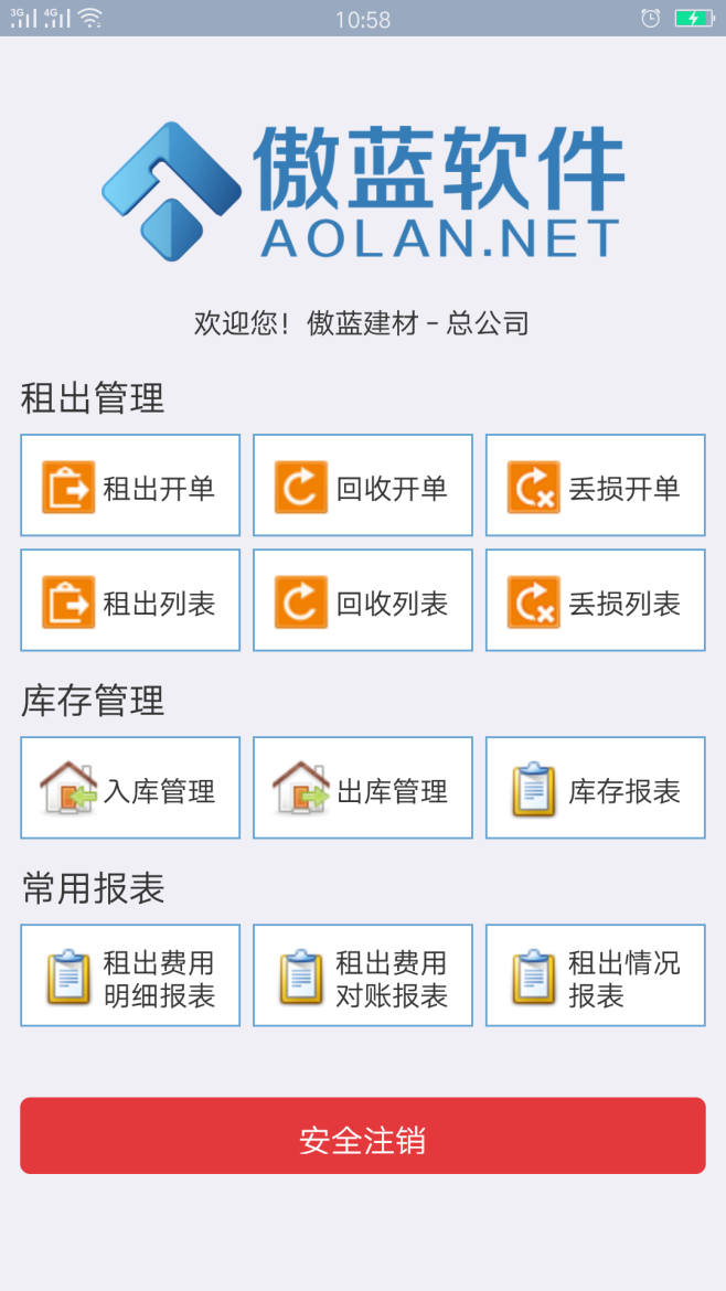 傲蓝建筑租赁管理软件手机app应用管理,可以使工地现场、仓库现场及业务员销售情况及时反馈给总部。公司员工通过移动端手机APP,登记好每笔业务:租出、回收、丢损、施工、销售、入库、出库等。信息及时反馈到总部,总部可以随时掌控各个工地的情况,及可用库存情况。