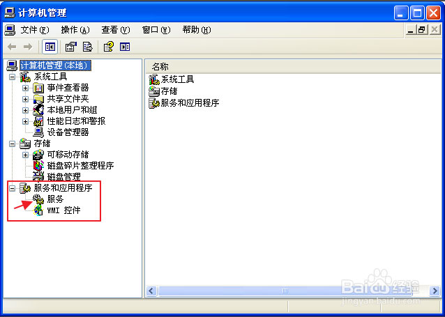 在“计算机管理”左侧找到“服务和应用程序”,点击“服务”。