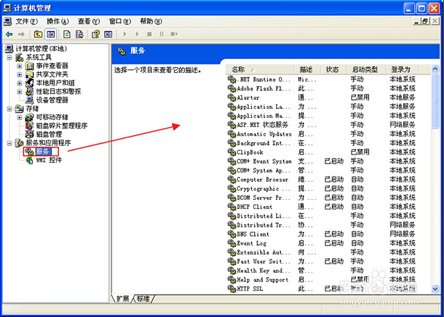 在“计算机管理”右侧会显示电脑已经安装的所有服务。