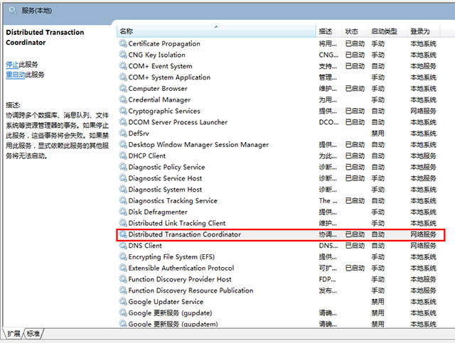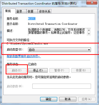 右击【Distributed Transaction Coordinator】属性。选择启动类型为自动,并且点击启动。