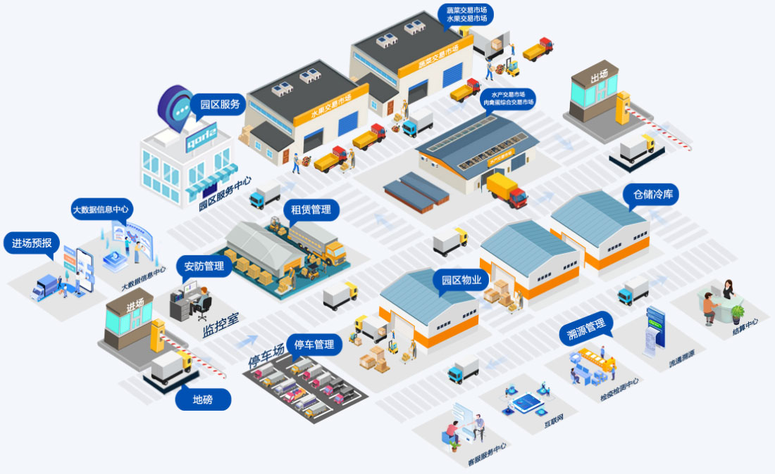 是一套集车辆进出场管理、食品安全追溯、市场商户管理、电子结算、仓储、冷链物流、可视化监控、市场物业招商、