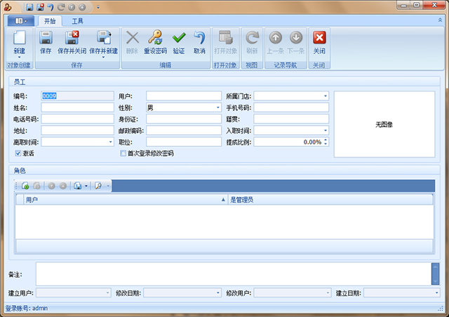 2. 点击工具栏的“新建”按钮,会弹出新建员工窗口,填写员工相关的信息和员工的登录用户名即可,如果选中“首次登录修改密码”,那么员工在首次登录的时候会弹出一个修改密码的对话框,如果没有选中,那么密码默认为空。
